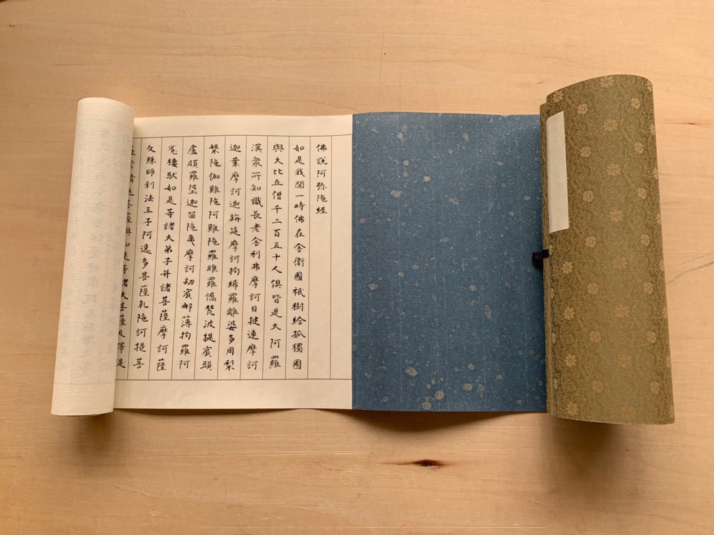 紙が作られるようになってからは、東洋では材質を紙とした巻子が主流になり、現在までその形はほぼ同じです。巻子は物事の記録の他、写経のために作られたものが最も多く残っています。このお経が書かれた巻子は、平安時代から鎌倉時代までには何万本という数が作られ、その中には「平家納経」などの華麗なものもいくつか誕生しています。